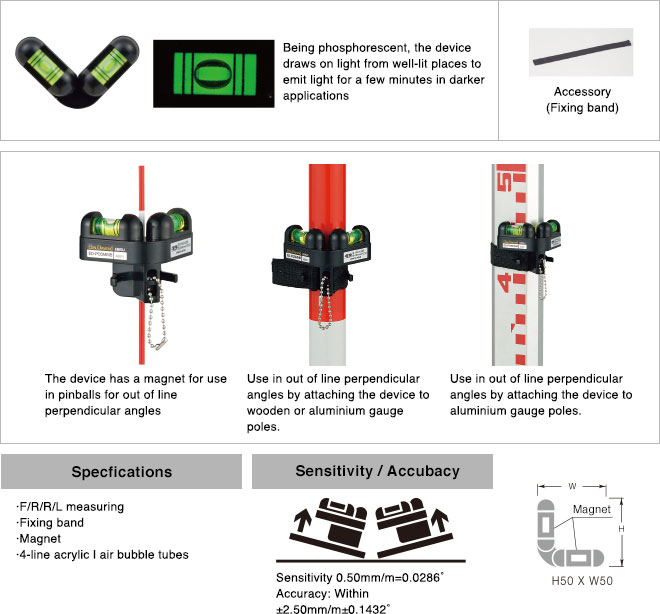 Being phosphorescent, the device draws on light from well-lit places to emit light for a few minutes in darker applications Accessory (Fixing band) The device has a magnet for use in pinballs for out of line perpendicular angles Use in out of line perpendicular angles by attaching the device to wooden or aluminium gauge poles. Use in out of line perpendicular angles by attaching the device to aluminium gauge poles. Specfications ·F/R/R/L measuring ·Fixing band ·Magnet ·4-line acrylic l air bubble tubes Sensitivity / Accubacy Sensitivity 0.50mm/m=0.0286˚ Accuracy: Within ±2.50mm/m±0.1432˚
